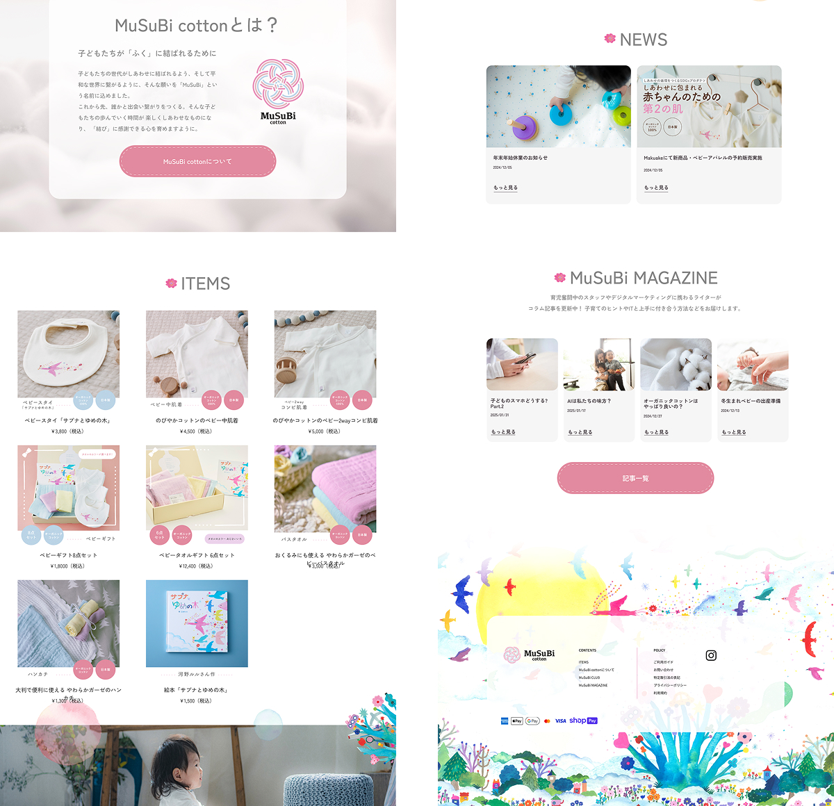 ブランド「MuSuBi cotton」の立ち上げにおいて、商品開発を軸とした取り組みを進めました。コットン栽培の課題に寄り添いながら、サステナブルで日常的に使いやすいアイテムを企画・デザインし、社会的価値を体現する商品群を形にしました。アートディレクター、デザイナー、エンジニア、動画クリエイターが密に連携する体制を活かし、デザインやコピーだけでなく、撮影や商品表現まで一貫して実行。ブランドの世界観を商品レベルで統一的に表現し、生活者に存在意義が伝わる基盤を構築しました。