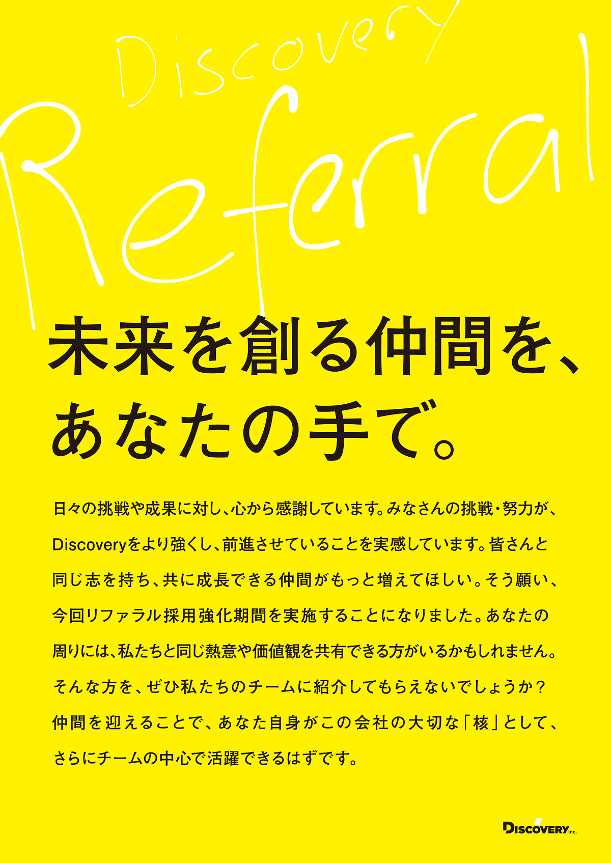 株式会社ディスカバリーは創立10周年を迎え、社員数の増加とともに組織が拡大する中で、カルチャーや価値観が希薄化してしまうリスクを抱えていました。特に課題となっていたのは、会社のカルチャーや働き方にフィットする人材を採用していくこと、そして既存社員のエンゲージメントを高めていくことです。単なるリファラル採用の周知では十分ではなく、社員に向けて「自分たちが大切にしている価値観」を再認識できるようなメッセージを発信し、採用と社内広報を同時に機能させる取り組みが必要とされていました。